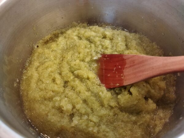 すでにすりおろしてあるため、灰汁をとるのが難しく、少し苦みが残ります。また果汁が入っていない分、薄味に仕上がります。その分の香りとコクを蜂蜜や梅酒で補います。
