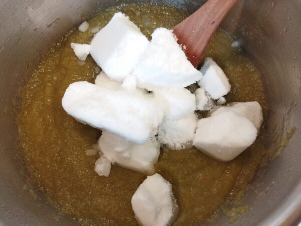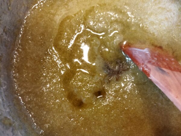 3. 一旦火を止め、砂糖を入れます。よくかき混ぜて、砂糖が溶けたら弱火にかけます。粘度が高く、熱い塊が飛ぶので、必ず弱火で、かき混ぜながら15分ほど煮詰めます。
