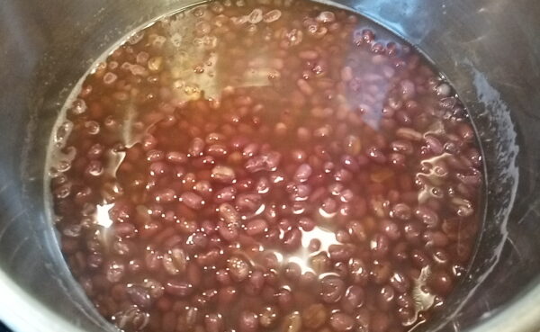 - 圧力鍋に小豆を入れ、分量の水を入れて火にかけます。落し蓋をして、圧力鍋の蓋をします。