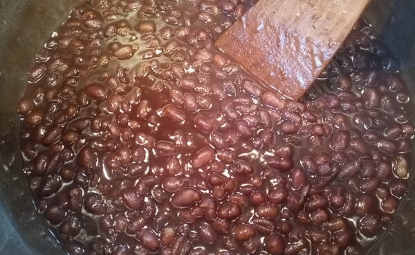 - 豆が指で簡単につぶれるようなら、ひたひたになるくらいまで余分な煮汁をとります。煮汁は残しておきます。豆が固いようなら、やわらかくなるまで煮ます。