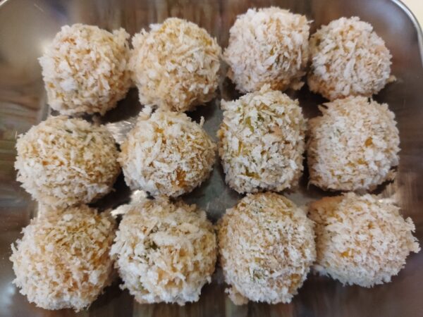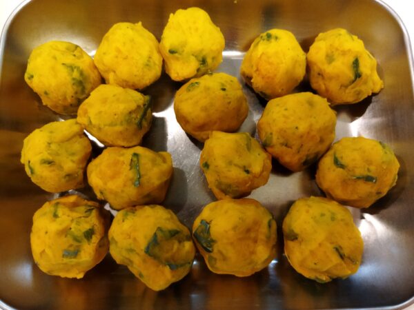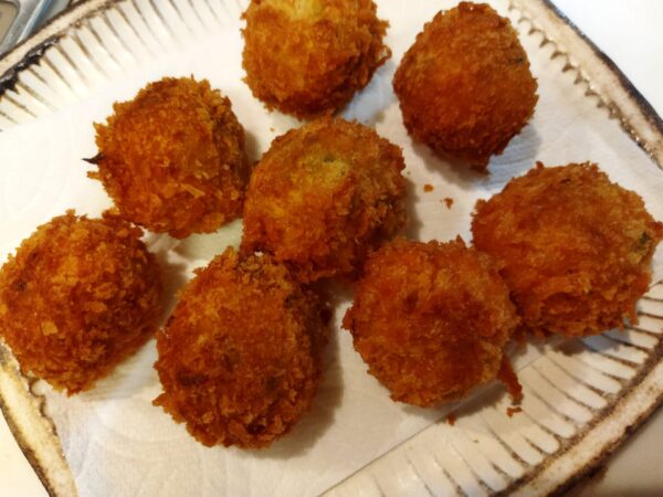 - 触れるくらいに冷めたら、一口サイズに丸めます。小判型、俵型でも良いですが、小さめに作ると衣とのバランスが良いです。