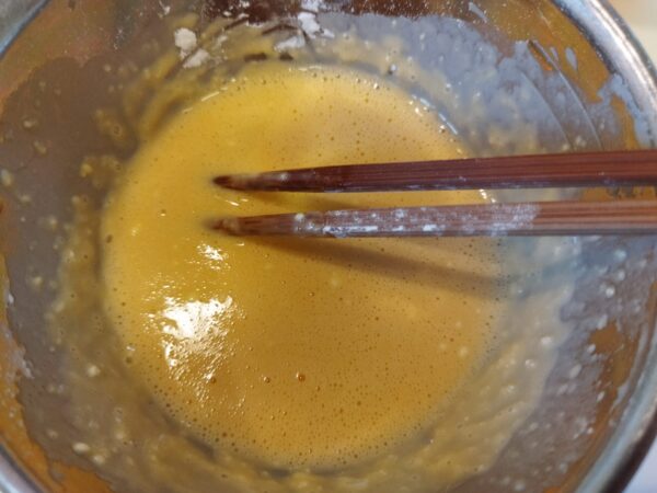 - バッター液を作ります。卵を割りほぐし、牛乳、小麦粉の順で入れ、よく混ぜます。