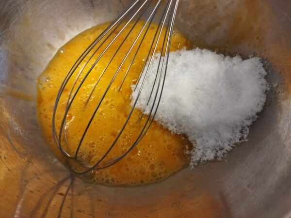 3. ボールに卵を割りほぐし、砂糖を入れてハンドミキサーで白っぽくなるまでよく混ぜます。