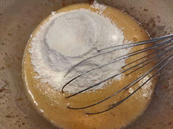 5. 薄力粉とベーキングパウダーを混ぜて、振るった粉を入れて、粉気が無くなる程度にさっくりゴムベラで混ぜます。
