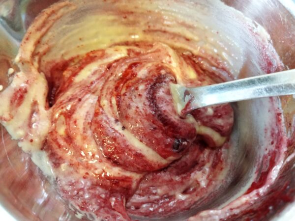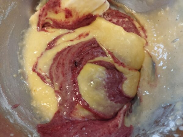 7. 残りの生地の入ったボールにジャムの生地を流し入れ、ゴムベラで1回だけ〇を描くように混ぜます。