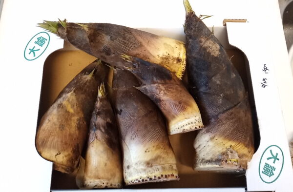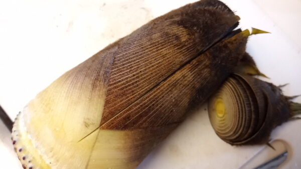 - タケノコの皮を2,3枚むいて、洗います。先端を1/4くらい切り落とし、皮に切れ目を入れます。