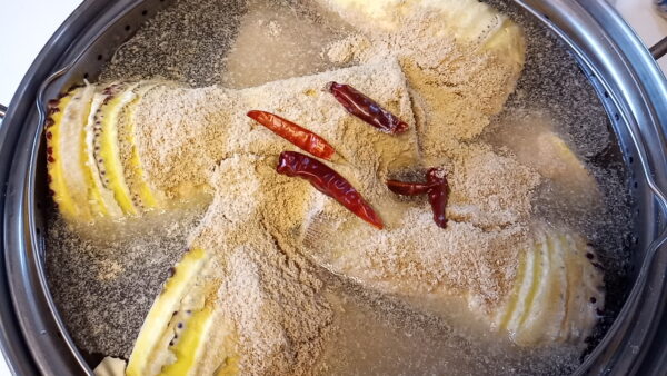 - 米ぬか、鷹の爪を入れ、火にかけます。
