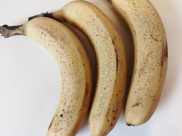- バナナを追熟させます。シュガースポットが目安です。おつとめ品にちょうどよく熟したものがあるときに買ってきて冷凍しておくと便利です。