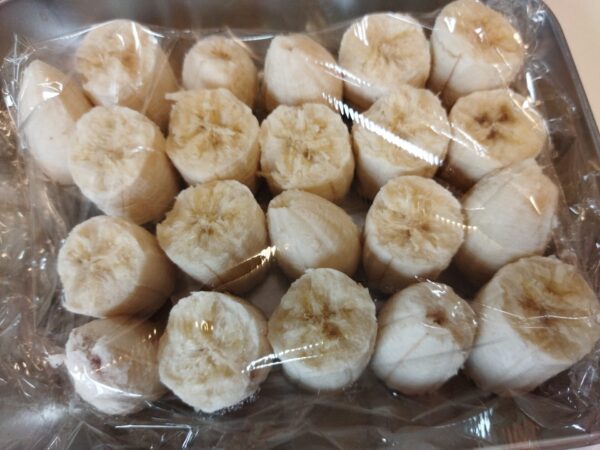 - 一口大にちぎってラップを敷いた金属バットに並べて冷凍します。ラップを敷かないと後で凍ったバナナがバットにくっついて大変なことになります。3時間程で凍ります。凍ったら保存袋に移し替えて冷凍保存します。