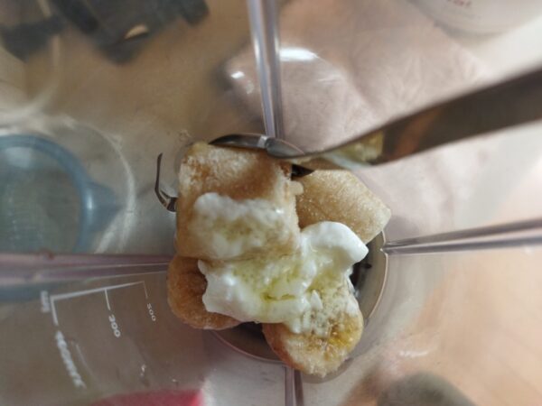 - ミキサーに、凍ったバナナ、ヨーグルト、はちみつをいれます。最後に牛乳を入れて混ぜまず。