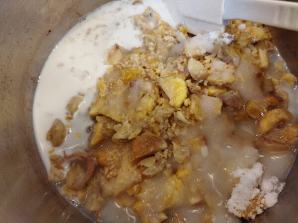 1. 実だけにした茹で栗の重さを計り、他の材料を計算して計ります。洋酒以外の全ての材料を鍋に入れて弱めの中火にかけます。