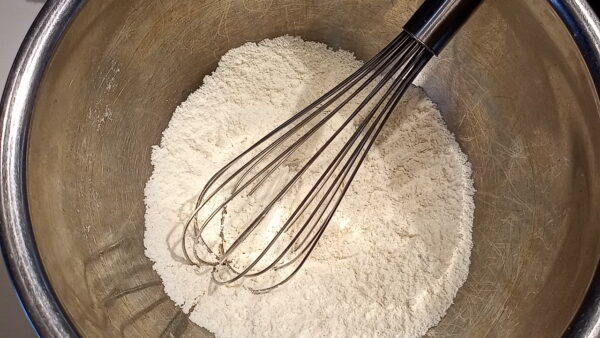 - 薄力粉と砂糖を計ってボールに入れたら、泡だて器でよく混ぜます。粉や砂糖のかたまりをつぶして、なめらかになるように。(粉をふるいにかけた場合は省いてよいです。)