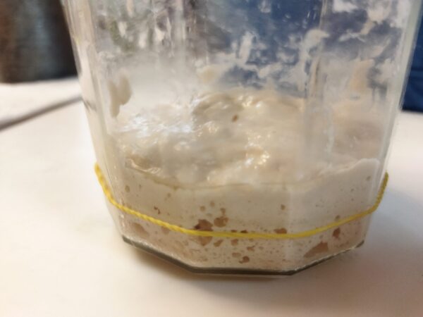7. 3回目を継ぎます。休ませたビンに強力粉50gと酵母液50gを足して、スプーンで混ぜます。粉っぽさが無くなったら、表面を平らにしてふたをします。平らにした上のラインに輪ゴムを移動させます。