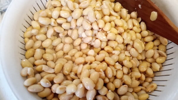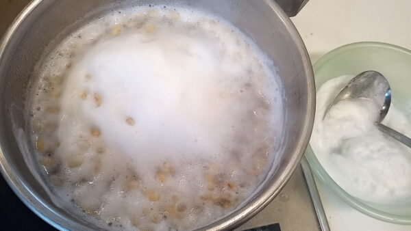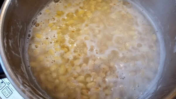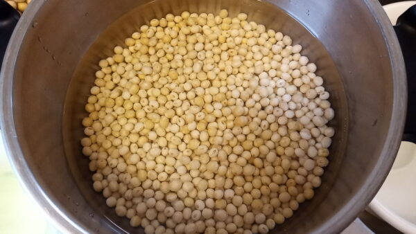 - 大豆をよく洗い、3倍の量の水にひたします。18時間以上。(気温が高くなる時期は冷蔵庫に入れた方がよい)