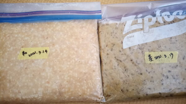 - しっかり空気を抜いて密閉したら、床下などの温度変化の少ない場所に置いて、一カ月ごとに天地返しします。10か月寝かせて完成です。