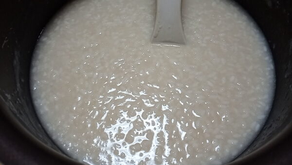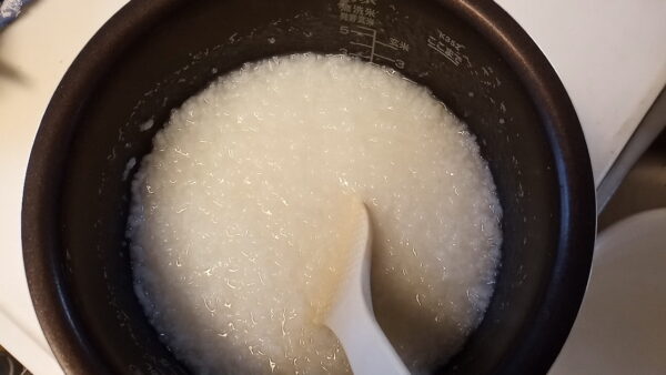 - 炊飯器でお粥を炊きます。米1合に対し、3合の水加減で炊きます。