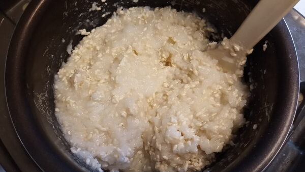 - お粥を60℃くらいに冷まし、ほぐした麹を入れて混ぜます。