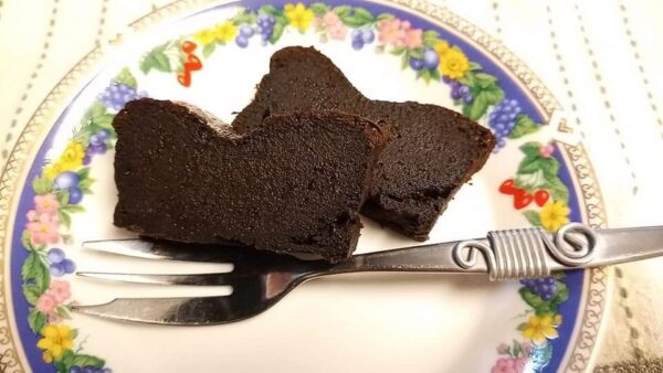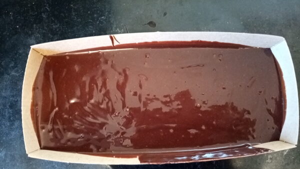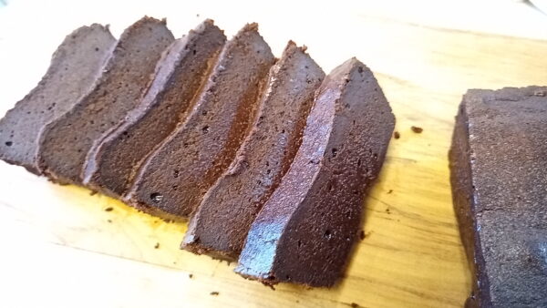 - 冷蔵庫で一晩寝かせて完成です。焼きたてはやわらかく、中までしっかり冷やさないと切り分けるのが難しいためです。
