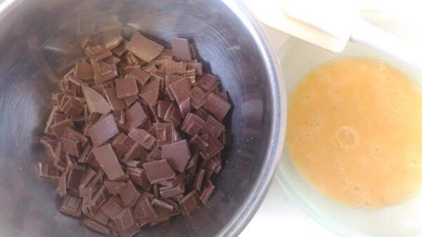 - たまごを割りほぐし、チョコレートを割っておきます。