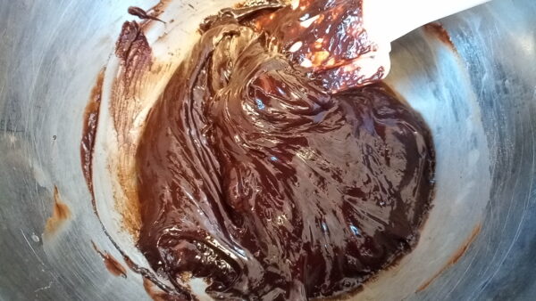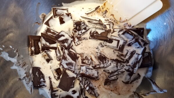 - チョコレートが溶けるまで混ぜます。温度が足りないようならフライパンに熱湯を入れて湯煎しながら溶かします。