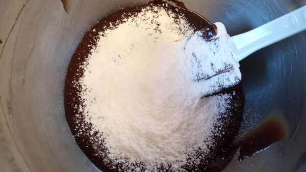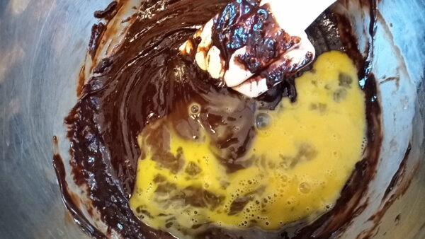 - ほぐした卵液を3回に分けてチョコレートのボールに入れます。その都度よくかき混ぜてから次の卵液を入れてください。