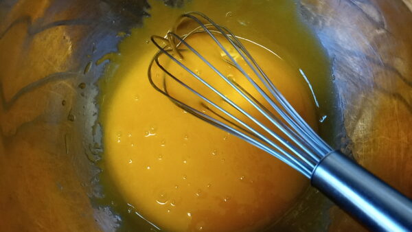 4. 次にサラダ油を一気に入れ、もったりするまでよく混ぜます。