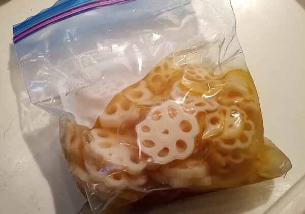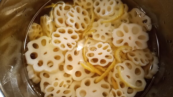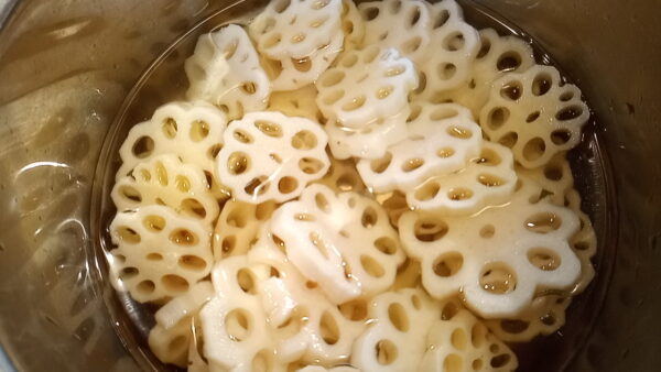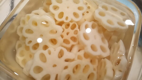 2. レンコンの皮をむき、3mmの厚さにスライスします。多少の厚みの誤差は気にしません。切ったものは酢水(1ℓに大さじ1程度)につけます。お好みで飾り切りをしても綺麗です。
