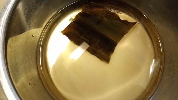 3. ①の鍋を中火にかけ、沸騰直前で昆布を取り出します。レンコンもザルにあげます。